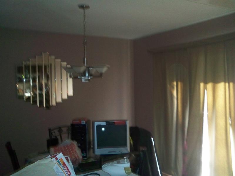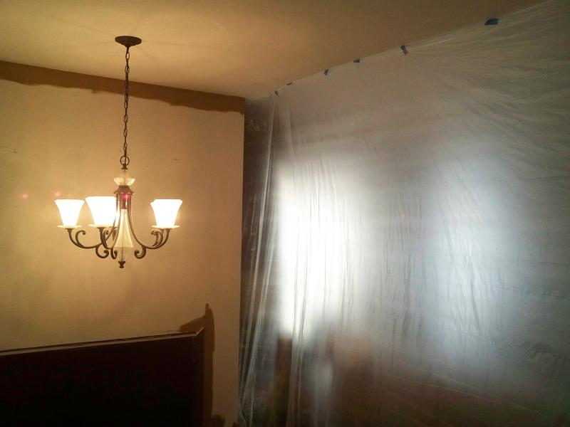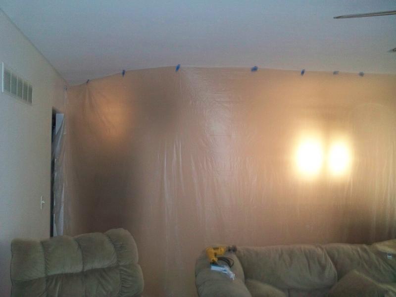 Hung plastic around the room to keep dust contained from sanding in stairwell. We removed wallpaper and refinished the walls, primed and painted